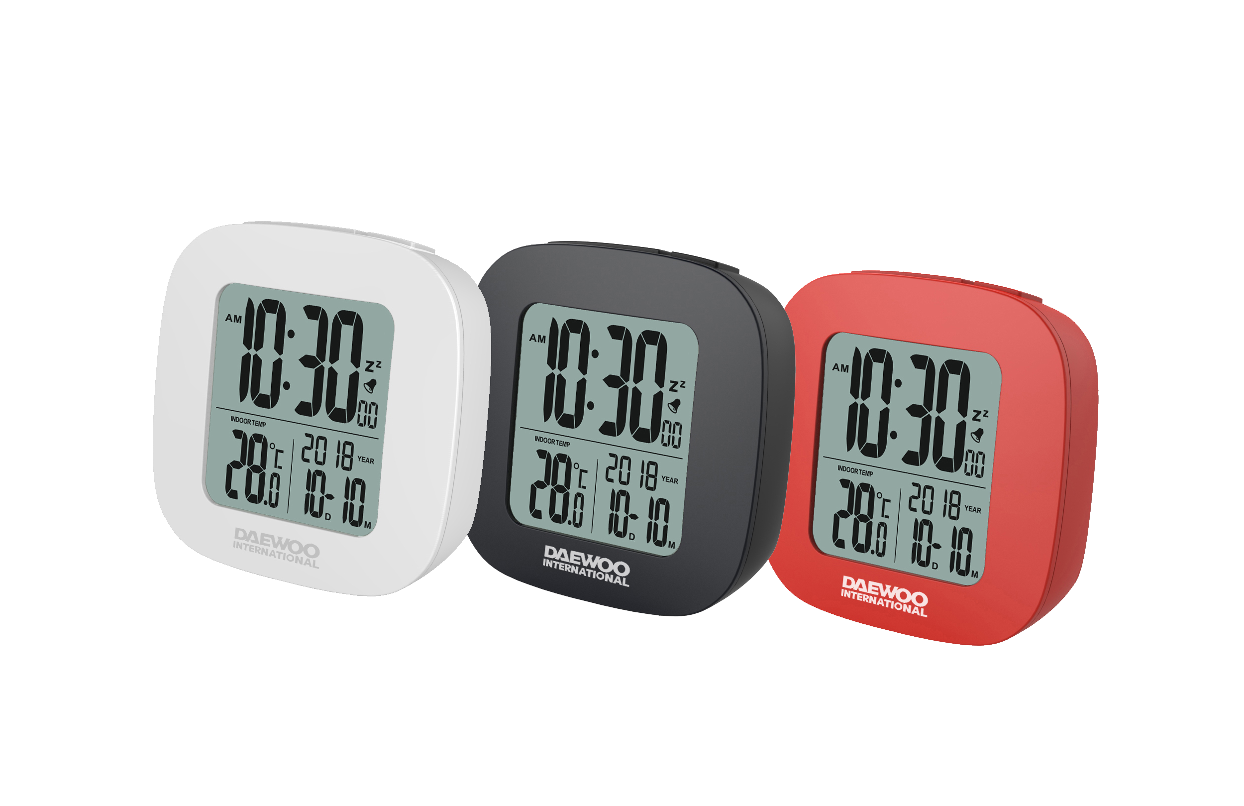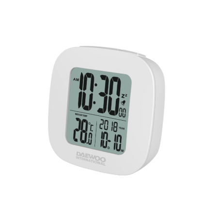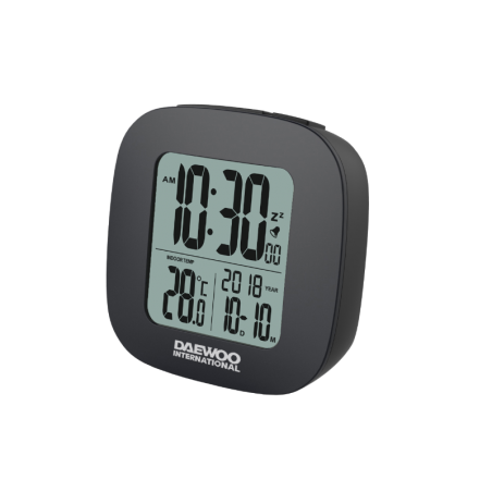 Ψηφιακό ρολόι-ξυπνητήρι της Daewoo, LCD οθόνη με ένδειξη ώρας, θερμοκρασίας και ημερομηνίας. Διαθέτει λειτουργία σίγασης, είναι μικρό σε μέγεθος και έχει φινίρισμα αλουμινίου.